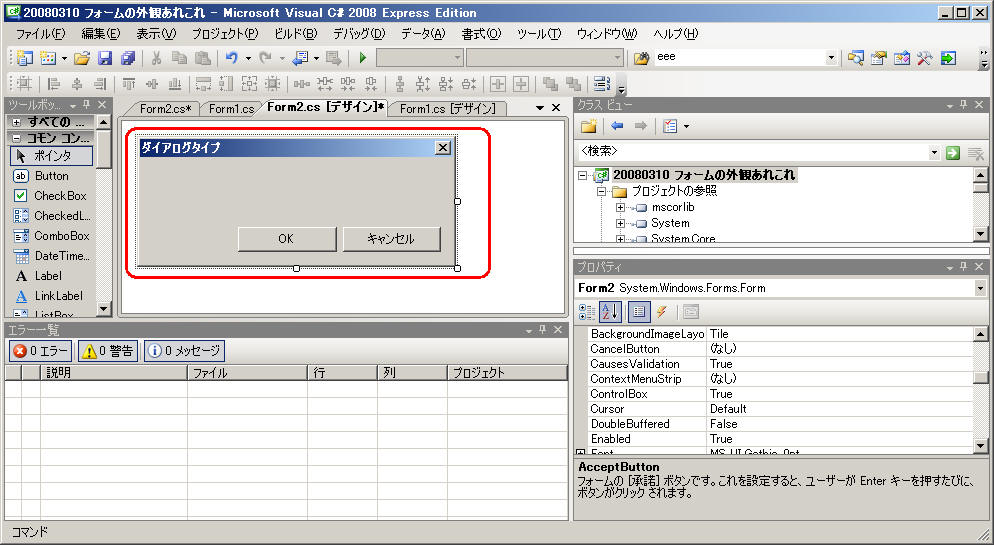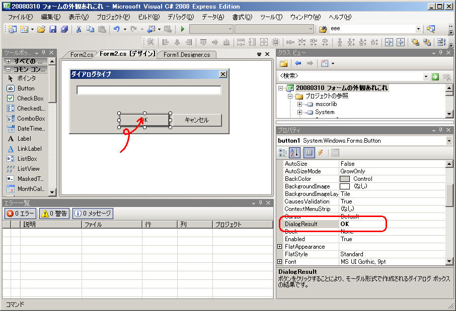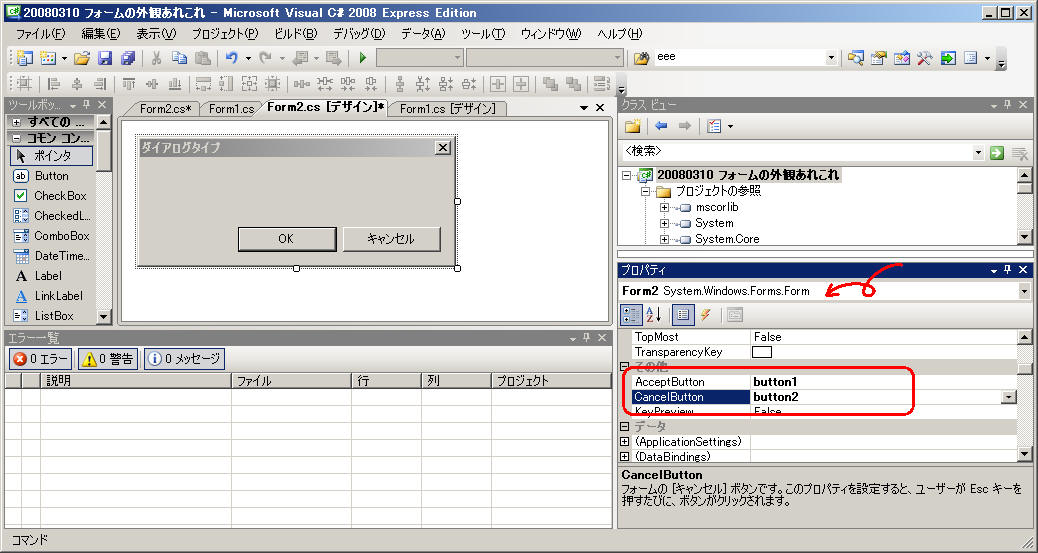 正規のお行儀として、OKボタン、キャンセルボタンのそれぞれに、DialogResult プロパティを割り付ける。