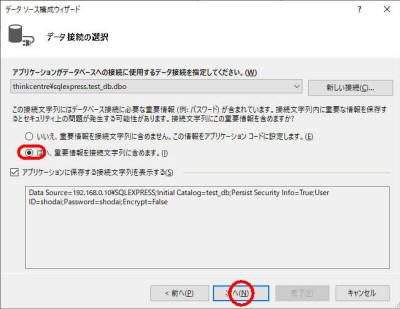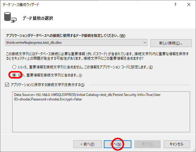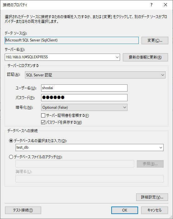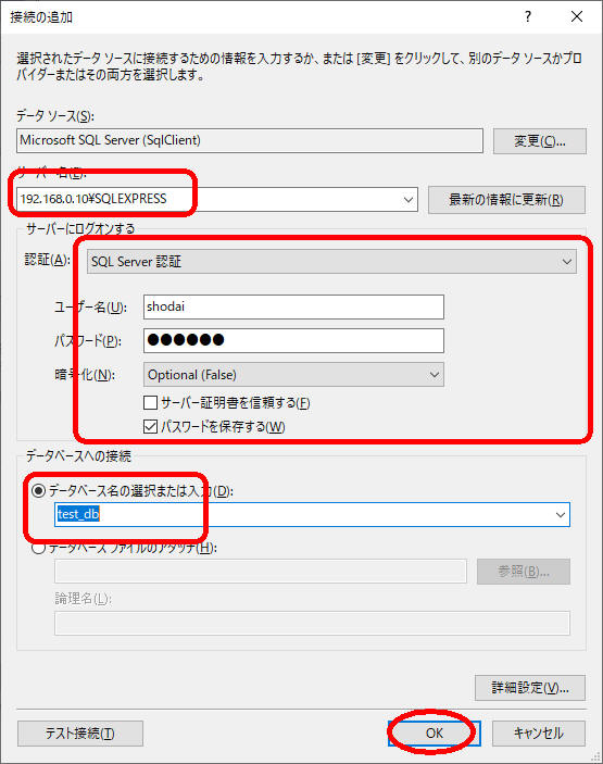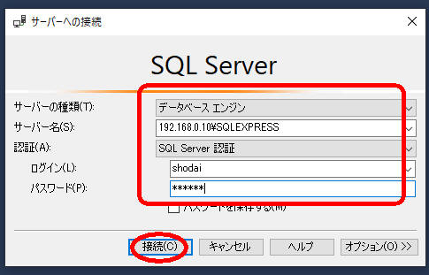 サーバー名 は、IPアドレス\インスタンス名まで含めて指定