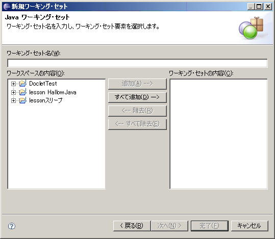 ワーキングセットの名前と、ワーキングセットに入れるプロジェクトを選択する