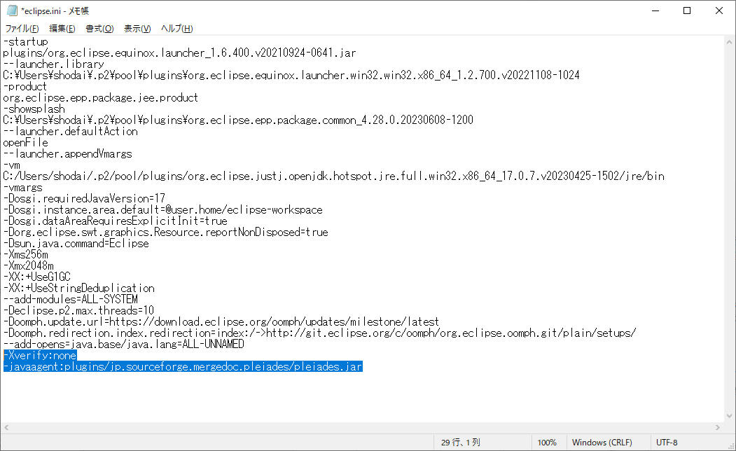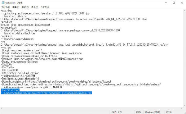 eclipse.ini ファイル の末尾に 以下の2行を追加