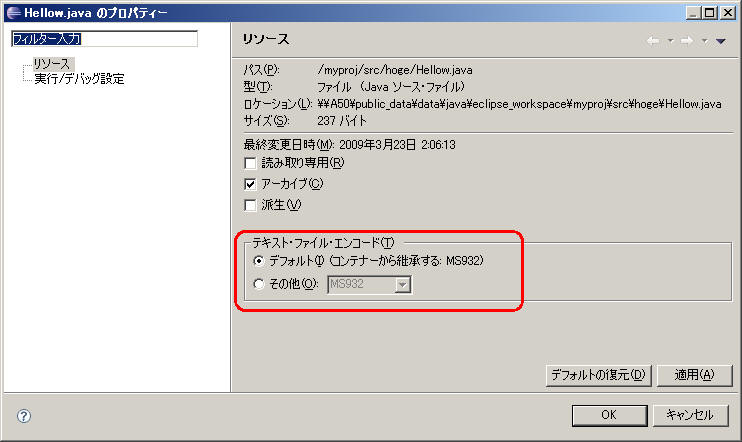 ファイル単位に指定する場合は、ファイルを右クリック→プロパティ