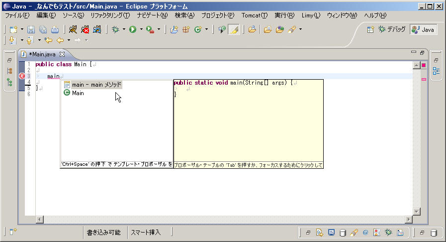 「main」とキーインして、ctrl + space してみる