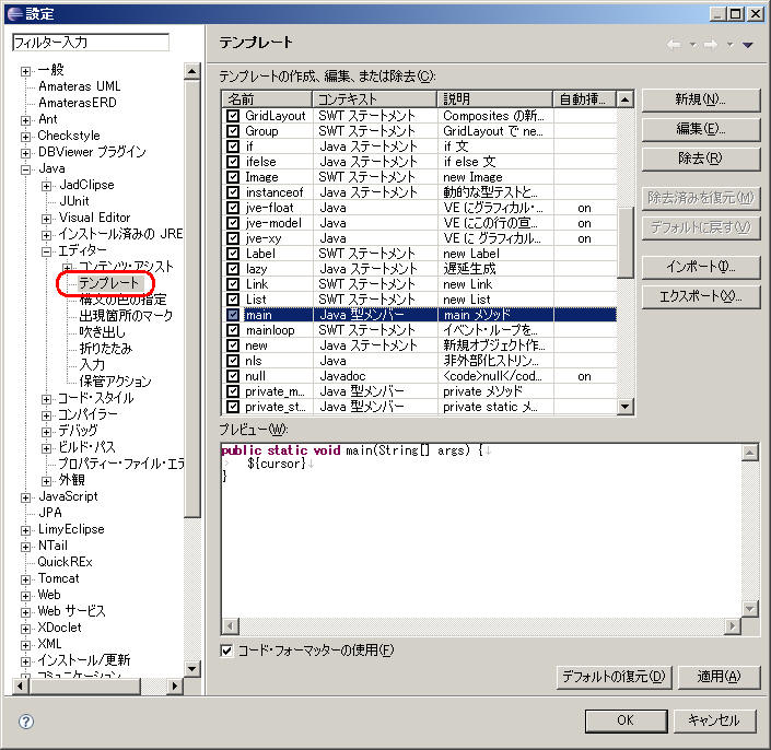 テンプレート…Javaエディタに特化したもので、Ctrl + space にて 貼り込めるもの