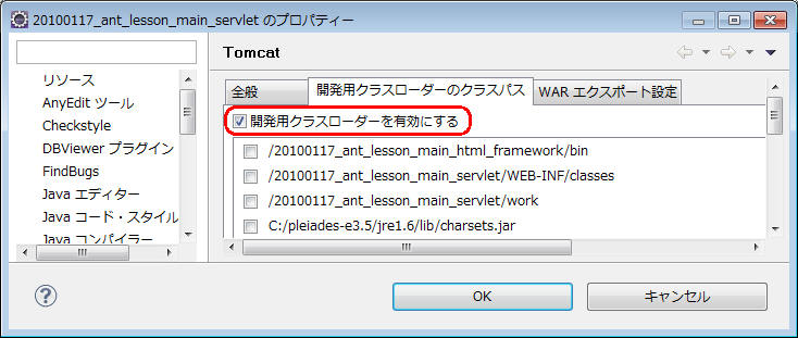 他のプロジェクトに依存したTomcatプロジェクトの場合、開発用クラスローダを有効にするが、