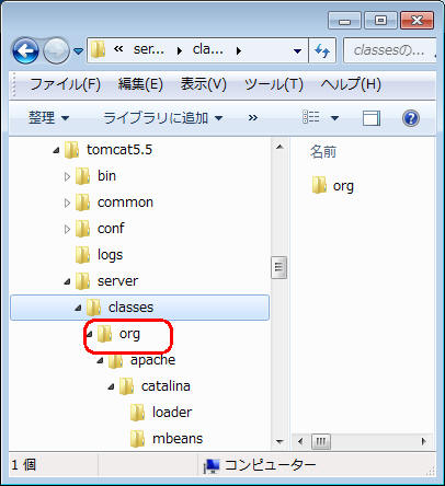 展開された orgフォルダ配下を、C:\pleiades-e3.5\tomcat5.5\server\classes 配下に配置