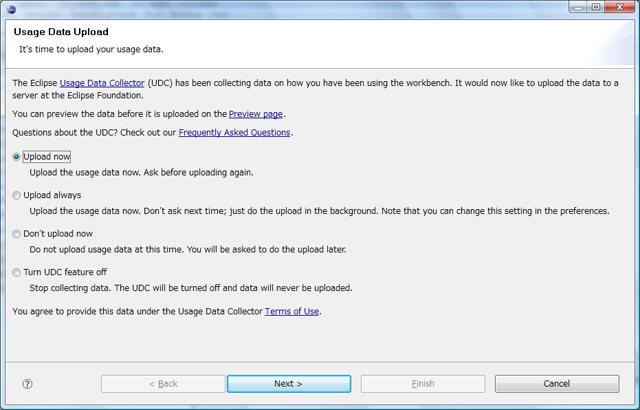 Eclipseの使用状況を、アップロードするもの。データを集めて、eclipseの改善に役立てようとするもの。
