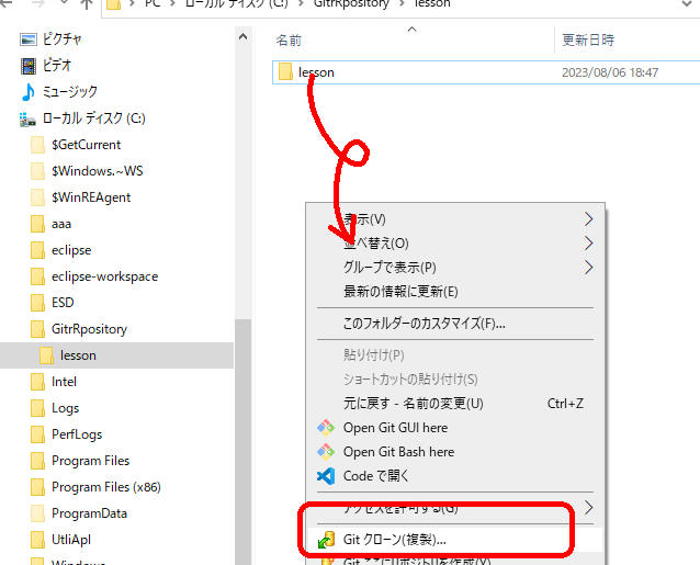 lesson 上で右クリックから、「Gitクローン(複製)」を選択
