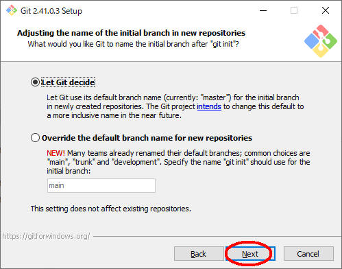 一般的にmasterが使用されるため、ココでは既定選択のままLet Git decideを選択します。