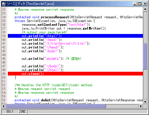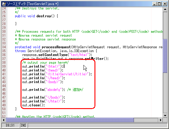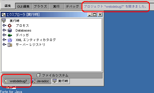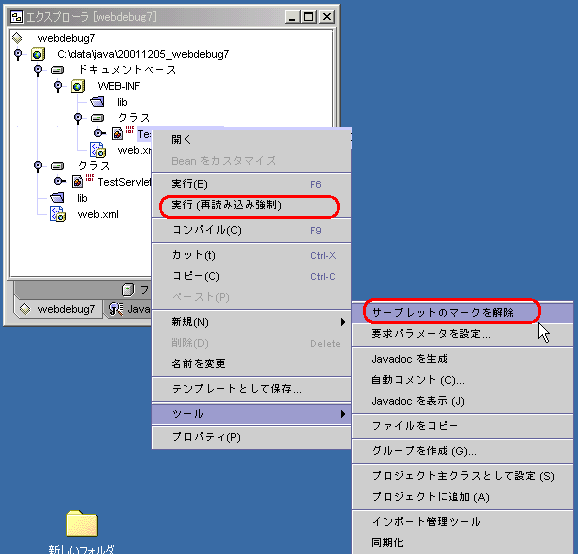 おっと、ここで、TestServlet7.javaがサーブレットソースとしてForteが正しく認識していいるか確認しておいて下さい。「実行(再読込強制)」が表示されていれば大丈夫です。また「サーブレットマークを削除」が表示されているはずです。他からサーブレットソースをコピーしただけでは認識されていません。その時は、[サーブレットのマークを設定]とかのメニューが出ているはずですので、サーブレットのマークを設定しておいて下さい。