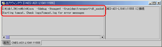 いろんなウィンドーが表示されたり、WEBブラウザーが「ページを表示できん」とかいろいろ騒ぎますが、出力ウィンドーが下記の状態にまるまでじっと待ってください。Tomcatサーバーの起動/接続に時間がかかるようです。