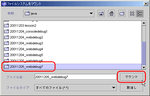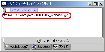 サーブレットやJSPを開発するので、APサーバーが扱えるフォルダ形式を作成する必要があります。この例ではマウントしたフォルダc:\data\java\20011205_webdebug をRootフォルダとしたWEB形式にしてみます。