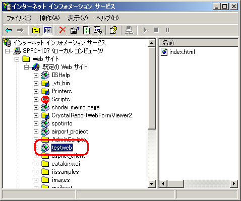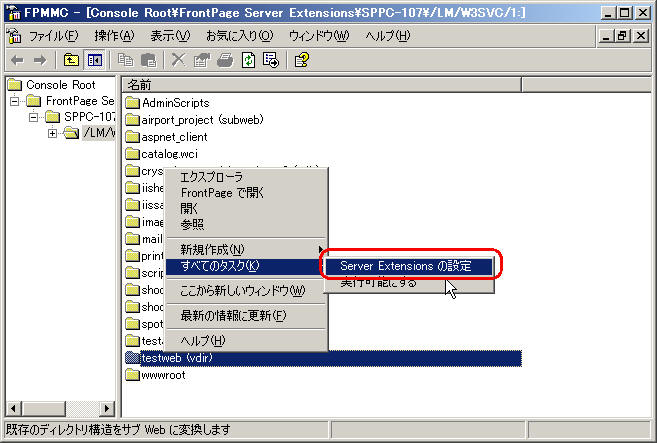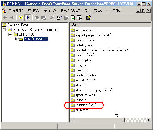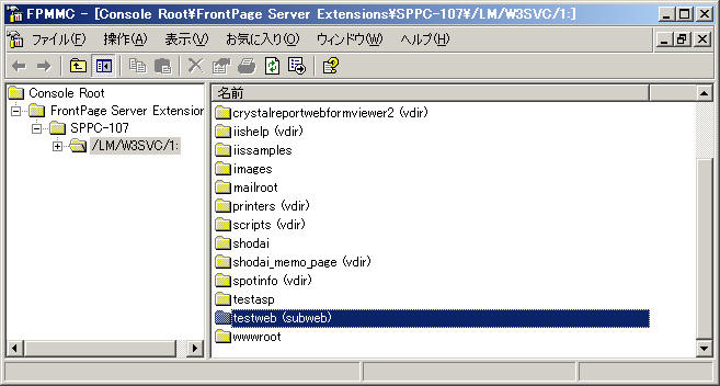 例)仮想ディレクトリ<C:\data\HTML\testweb\>に展開されるWEBをFrontPageで連係させる。