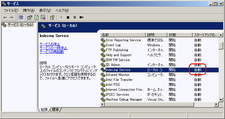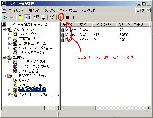 FrontPageと連動した検索コントロールは便利で、しばしば使っている。この検索サービスは、osのインデックスサービスを利用している。たまに検索ページから検索しようとすると「インデックスサービスは稼働していません…」のたぐいのメッセージが出てしまう。