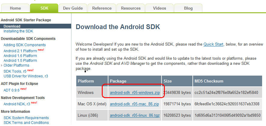 取得した android-sdk_r05-windows.zip を任意フォルダ で解凍。