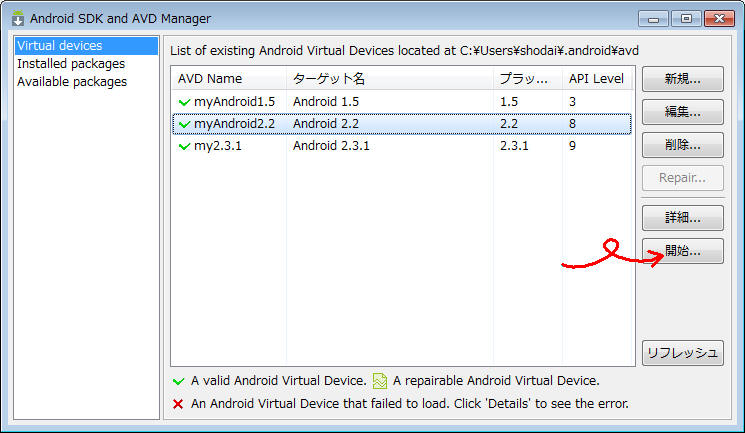 アプリケーションの実行を行えば、エミュレータは自動的に起動される。が、非力なマシンではエミュタータの起動が遅く、アプリケーションのインストールに失敗する事がある。