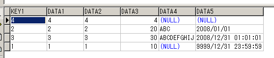CREATE TABLE SHODAI.TEST2 ( KEY CHAR(4), DATA1 NUMBER(10,0), DATA2 CHAR(20), DATA3 CHAR(1000) ) /