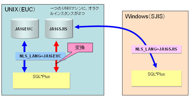オラクルインスタンスのキャラクタセットとNLS_LANGが等しい場合は、コード変換は行われない。