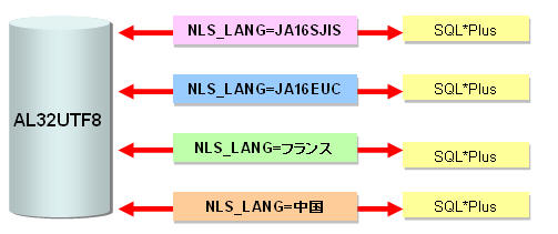 オラクルインスタンスのキャラクタセットと異なる場合は、OracleNETが変換してくれる。