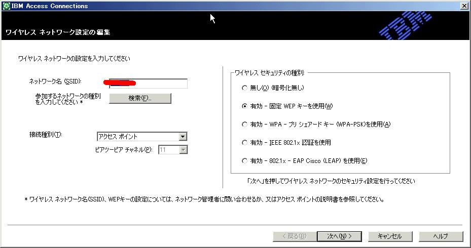 SSIDは、アクセスポイントで設定したものと同じIDを設定。