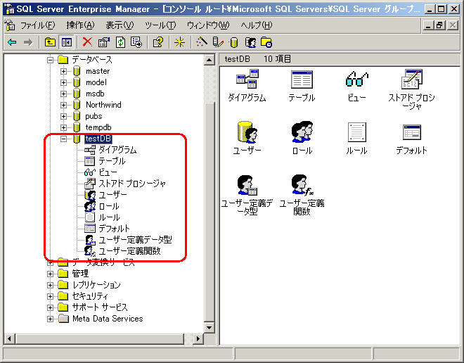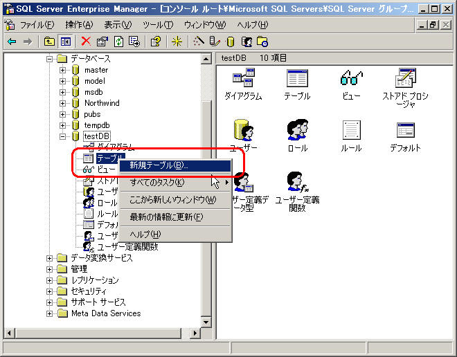 [スタートメニュー]→[Microsoft SQL Server]→[Enterprise Manager] にて、管理コンソールを起動する