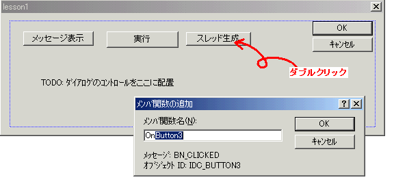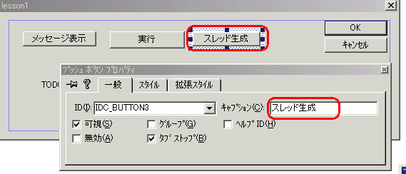 では、この見本を昨日作った関数で呼んでみることにしましょう。三つ目のボタンを作って、それをクリックしたら、スレッドを生成してみるようにします。