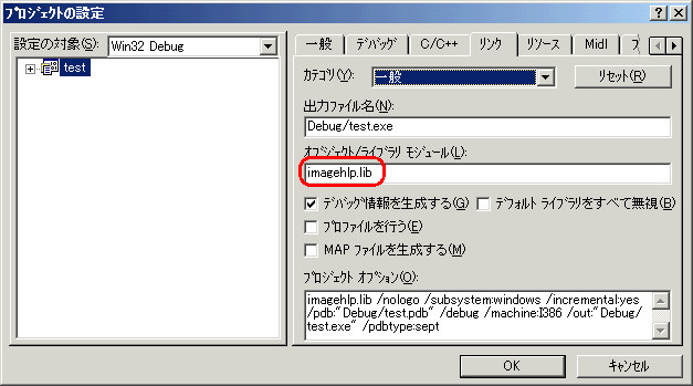 ただし、imagehlp.lib を組み込む必要あり。
