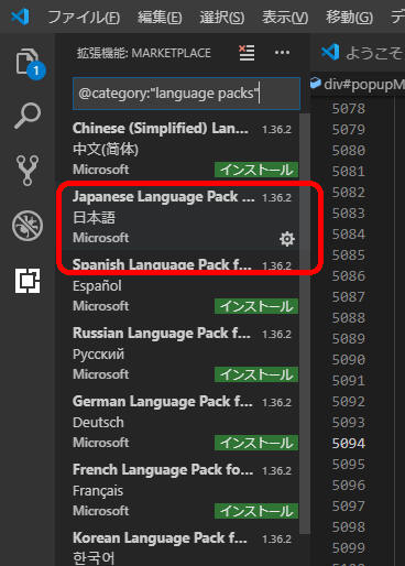 追加言語の選択、、、を行うと、VSCODEの左側にエリアが表示されるので、日本語をインストールすればよい