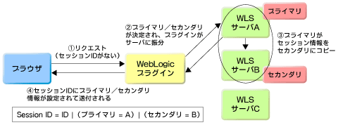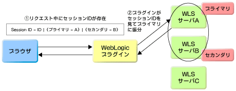 一方、Webブラウザが2回目以降アクセスした場合は、リクエスト中にセッションIDが存在し、WebLogicプラグインがセッションIDの内容を識別して、プライマリにリクエストを振り分ける。