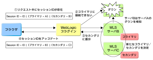 もし、プライマリがダウンしている場合は、WebLogicプラグインはリクエストをセカンダリに振り分けるとともに、ほかにもクラスタを構成しているサーバがある場合は、新たにプライマリ/セカンダリのペアを決定し直す。