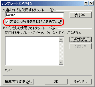 テンプレートファイルのスタイル書式を変更した場合、そのテンプレートを使用しているdoc全てに反映させるためには、各docで自動反映できるように設定しておく必要がある。