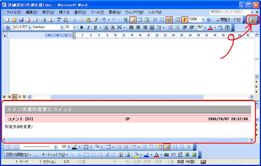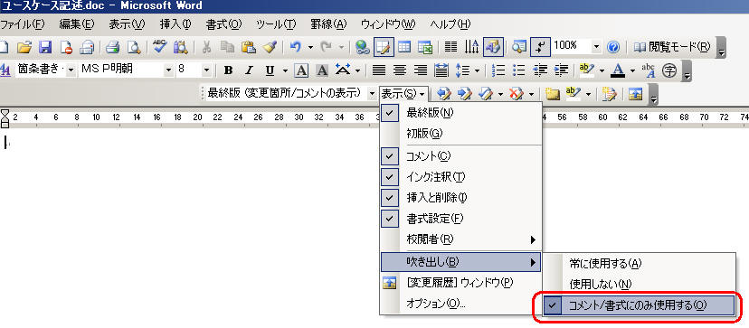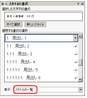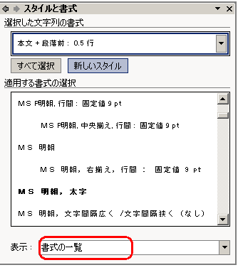 表示に「書式の一覧」が設定されている時は、現在使用されている書式が全て表示される。 不統一な書式で書かれた文章の書式を把握するのには向いている。 最初からスタイルありきで作成していった場合は、スタイルを流用して変更した書式も表示されるので、うっとうしい。 →初期設定と思われる。 Word2002からの新機能である。 |