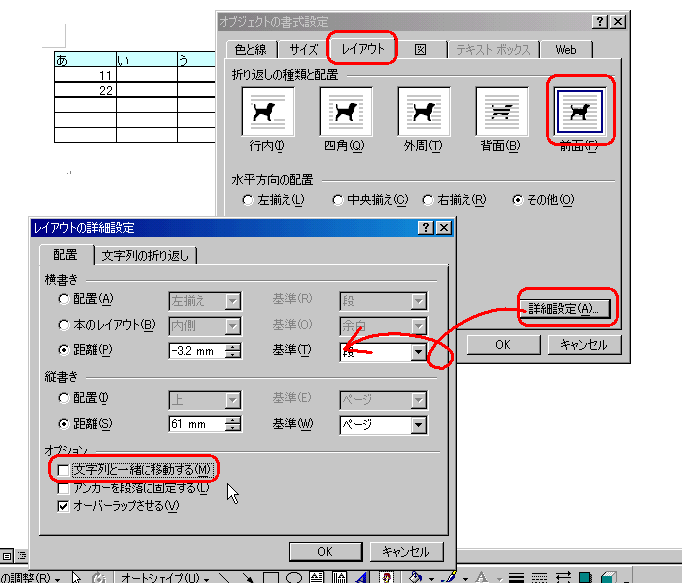 「レイアウトタブ」から「前面」、詳細設定で「文字列と一緒に移動する」を外すと、文字と関係なくフリーな位置に置くことができる。
