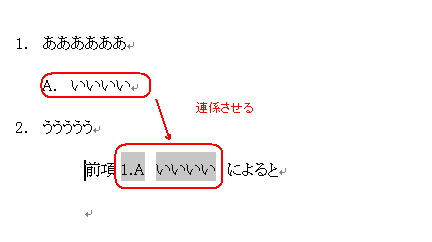 | 段落番号(内容を含まない) | \n\h | n:参照先の段落の段落番号全体を、末尾にピリオドを付けずに表示します。以前のレベルに関する情報は、現在のレベルの一部として含まれていない限り表示されません。 |