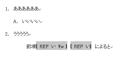 | 段落番号(内容を含む) | \w\h | w:文書内のどの位置から参照した場合でも、ブックマークが定義された段落の段落番号を、上位レベルの番号も含めて挿入します。たとえば、段落 "ii" を参照する場合、REF フィールドに \w を付けて指定すると、実行結果として "1.a.ii" が表示されます。 |