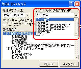 Office2003では、[メニューバー]→[挿入]→[参照]→[相互参照]にて行なうようです。2006/04/06